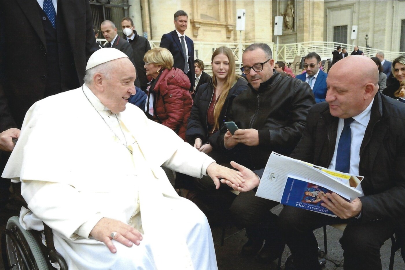 Segue la consegna della corona del Rosario e una foto con firma del Pontefice.