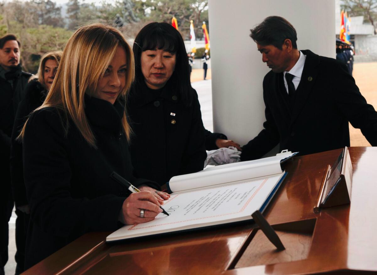 La giornata coreana di ieri di Meloni si è aperta con un momento istituzionale: ha visitato il ‘Seoul National Cemetery’, il cimitero nazionale dedicato ai caduti per la nazione, in particolare durante la Guerra di Corea. Ha partecipato alla cerimonia di saluto alla bandiera, deponendo una corona e offrendo l’incenso per tre volte, secondo il rituale. Nel Libro d’Onore ha scritto: “Oggi sono qui per inchinarmi dinanzi a tutti coloro che hanno sacrificato il bene più prezioso in nome della Patria. Il loro sacrificio non è stato vano, perché ha dato voce a un popolo e un futuro a una Nazione. Oggi, come ieri, l’Italia e la Corea sono fianco a fianco per difendere la libertà e costruire la pace”. La visita al cimitero è stata il primo impegno ufficiale in Corea, ultima tappa del tour asiatico. In agenda ci sono stati gli incontri con i rappresentanti delle principali aziende italiane presenti nel Paese e, oggi, il bilaterale con il Presidente Lee Jae-myung.