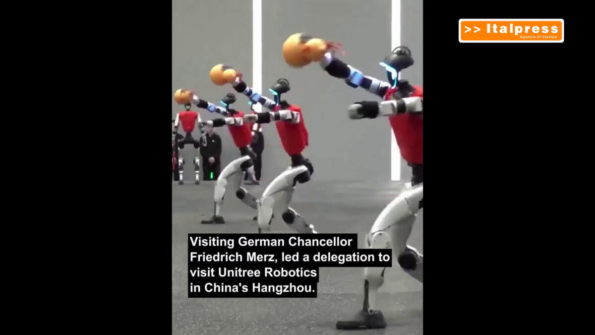 Video Pillole Il cancelliere tedesco Merz visita un’azienda cinese di robot umanoidi giovedì, 26 Febbraio 2026 di Italpress 1 minuto di lettura Il cancelliere tedesco Friedrich Merz ha visitato a Hangzhou l’azienda cinese di robot umanoidi Unitree Robotics e ha assistito a esibizioni di pugilato e arti marziali dei robot. (XINHUA/ITALPRESS) mec/abr/ (Fonte video: Xinhua) Facebook X Pinterest Linkedin Whatsapp Reddit Email Consigliati Tg Sport – 26/2/2026 Nica “A maggio Country presentation per opportunità economiche in Moldova” Dazi, Tridico “Accordo tra Ue e Usa va sospeso per proteggere le nostre aziende” Italpress Lascia un commento Annulla rispostaYour email address will not be published. Questo modulo raccoglie il tuo nome, la tua email e il tuo messaggio in modo da permetterci di tenere traccia dei commenti sul nostro sito. Per inviare il tuo commento, accetta il trattamento dei dati personali mettendo una spunta nel apposito checkbox sotto: Acconsento