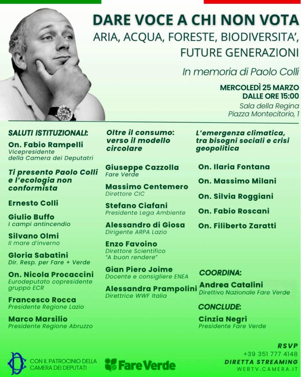 Si terrà presso la Sala della Regina di Palazzo Montecitorio l’incontro “Dare voce a chi non vota”, un evento dedicato ai temi ambientali e al futuro delle nuove generazioni, in memoria di Paolo Colli. Un’occasione di confronto tra istituzioni, esperti e associazioni su clima, biodiversità e modelli di sviluppo sostenibile
