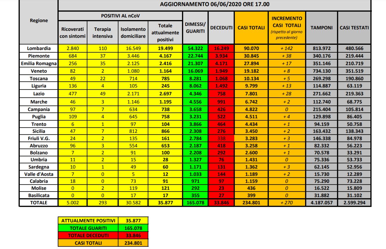 ROMA (ITALPRESS) – A oggi, 6 giugno, il totale delle persone che hanno contratto il virus e' di 234.801, con un incremento rispetto a ieri di 270 nuovi casi. Il numero totale di attualmente positivi e' di 35.877, con una decrescita di…